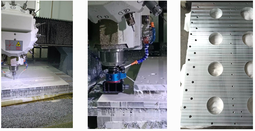 龍門加工中心對自動化設(shè)備大鋁板進行雕銑、鉆孔、攻牙、切削等加工