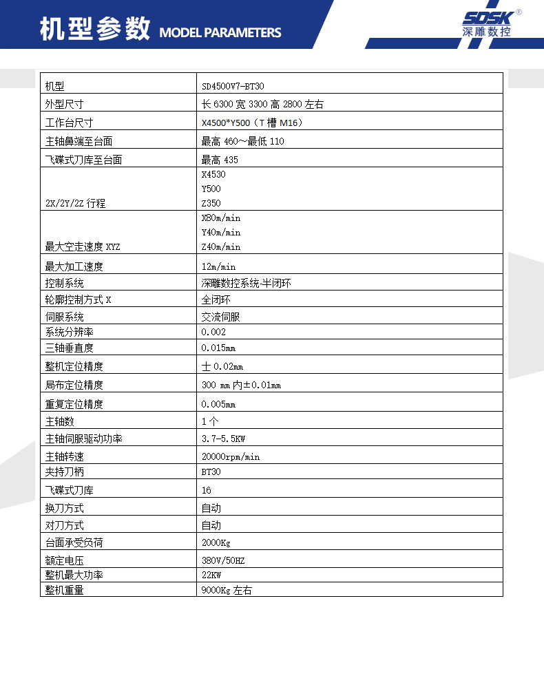 大型3米-6.5米天軌式加工中心SD-4500V7-BT40數(shù)控機(jī)床